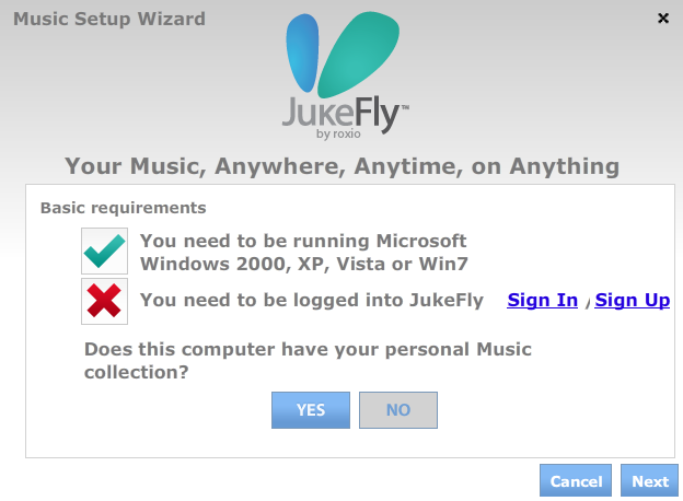 Une fois ces étapes effectuées, JukeFly renvoie directement l'utilisateur à son navigateur Web par défaut. L'application n'est fonctionnelle qu'avec Windows et un navigateur supportant Flash.